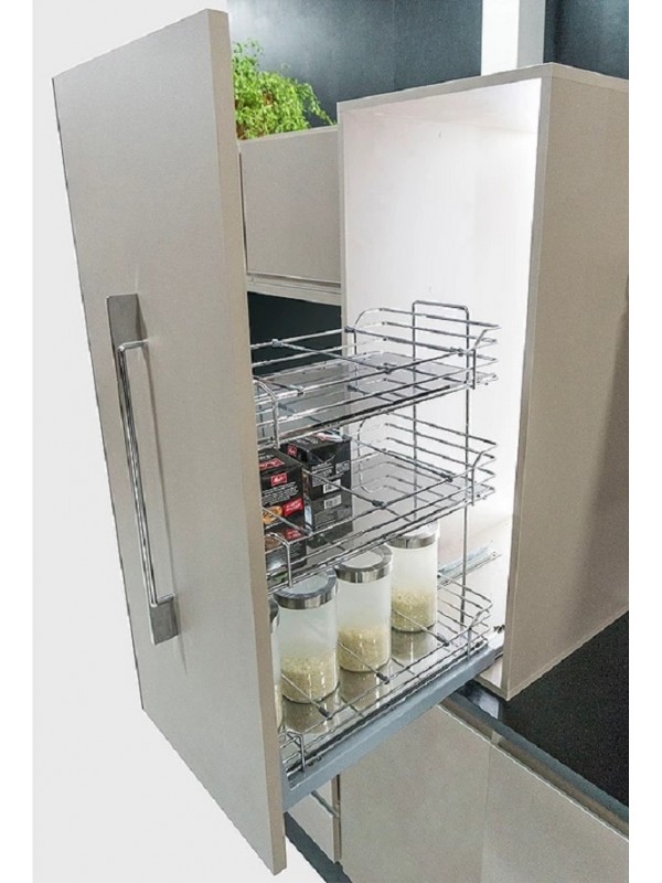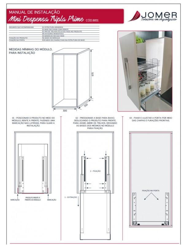 Este produto é confeccionado em aço carbono, tem sua estrutura aramada no acabamento cromado e seu carrinho pintado. Sua largura e seus três estágios potencializam o armazenamento e otimizam a utilização do módulo. Possui três bandejas em inox, que protegem o aramado de resíduos e dão maior estabilidade ao acomodar objetos. Acompanham trilhos ocultos com deslizamento extra-suave e fixação de base, que facilita a utilização do produto em módulos já existentes, contanto que respeite a largura interna mínima para instalação. Seus divisores são removíveis, facilitando a organização dos produtos.